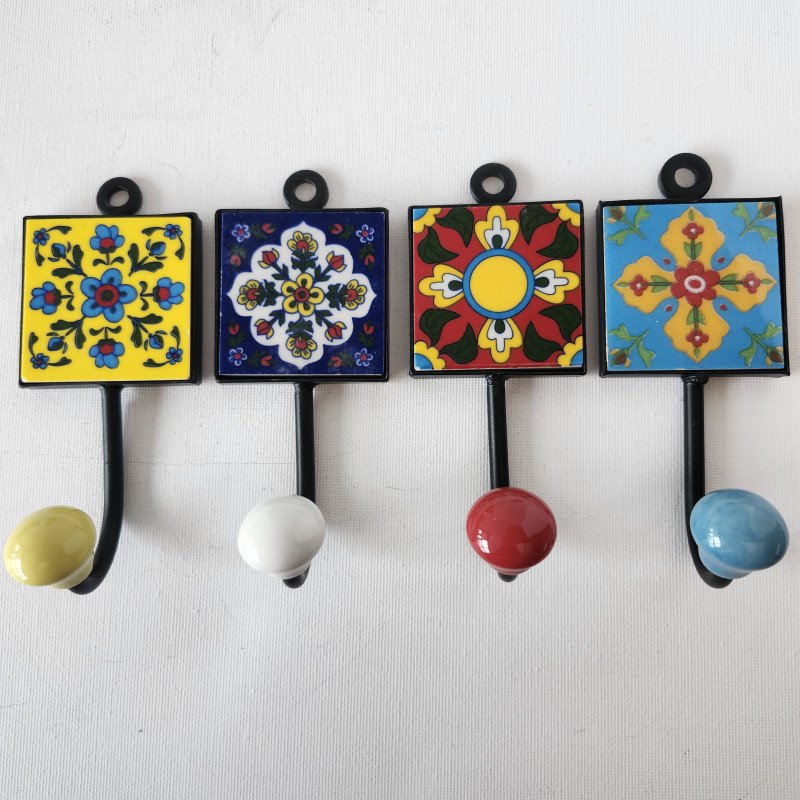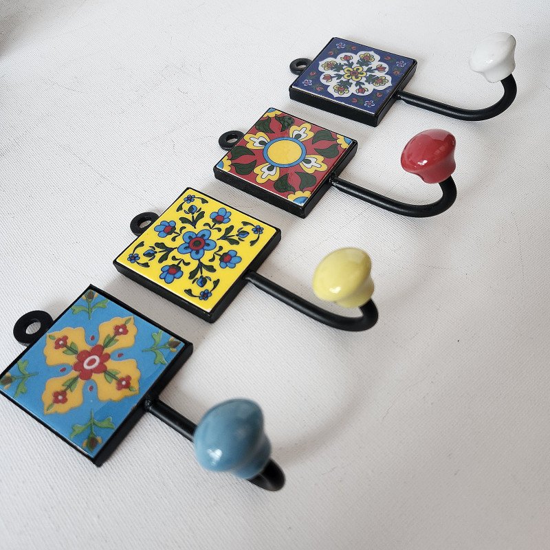 Set of 4 handpainted ceramic & iron wall hooks 2 inch by 5 inch. Mediterranean Collection of 4 different framed tiles with hooks- as shown in photo.