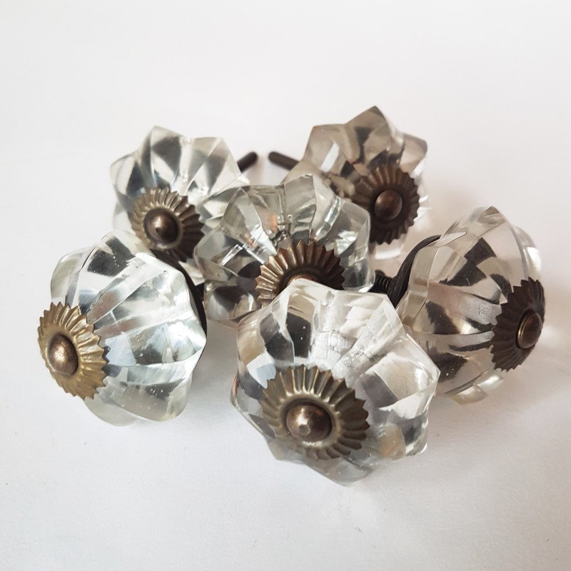6 Piece set of crystal clear glass cabinet knobs, vintage style bronze accents. Drawer pulls, cupboard and wardrobe knobs. Handcrafted 1.75 inches in diameter.