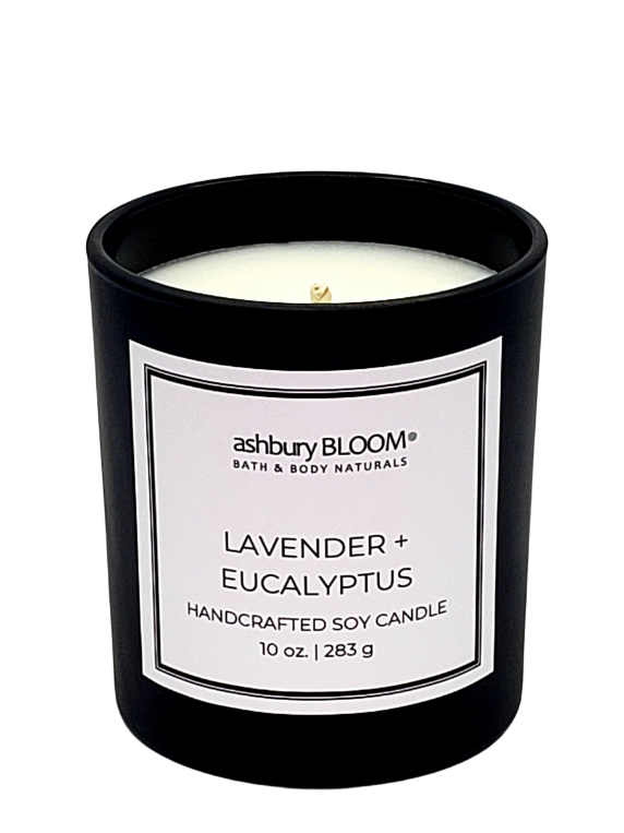 LAVENDER+EUCALYPTUS SOY WAX CANDLES – Our Lavender and Eucalyptus Candle is the perfect addition to your relaxation routine. Immerse yourself in the fresh aroma of lavender, known for its calming effects, mixed with the invigorating scent of eucalyptus. Sit back, relax, and feel your stress melt away.