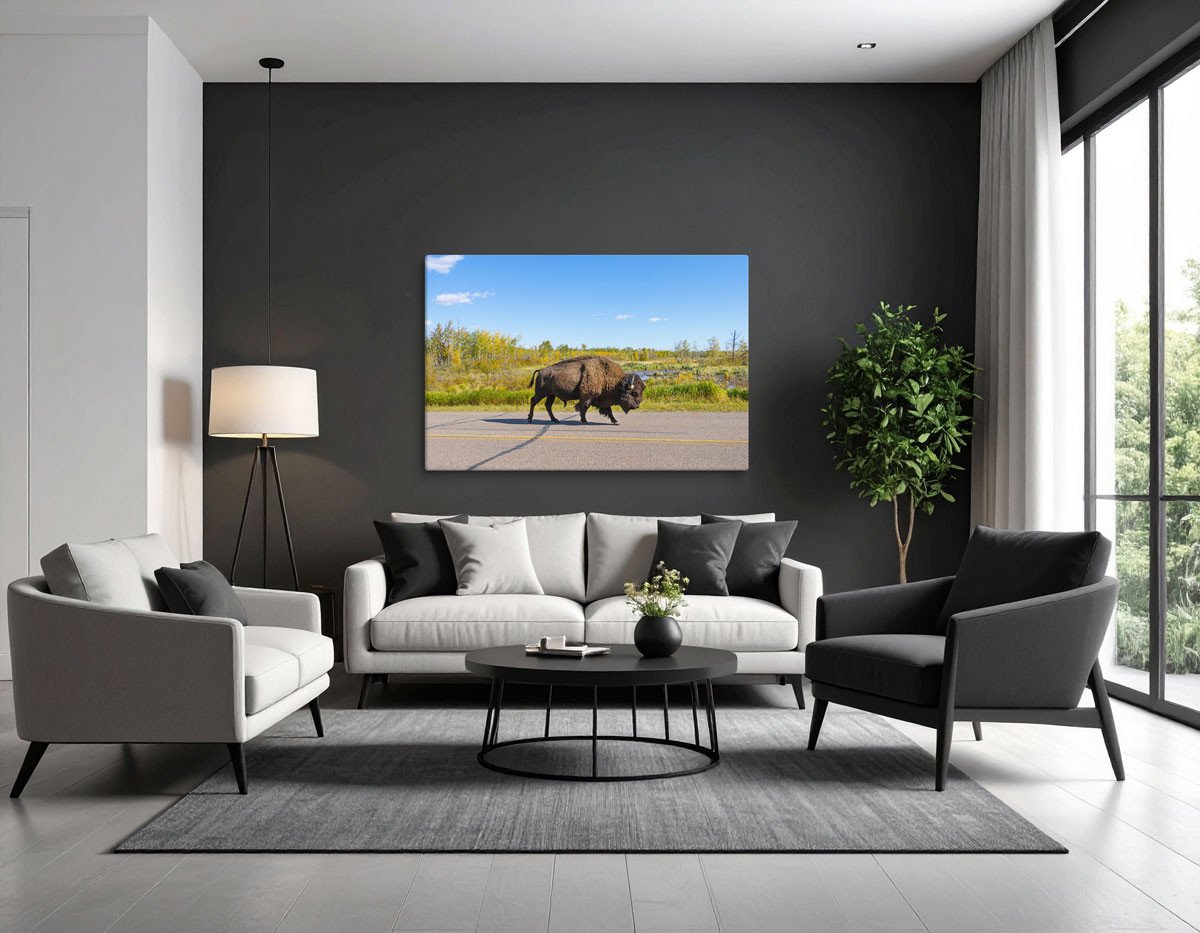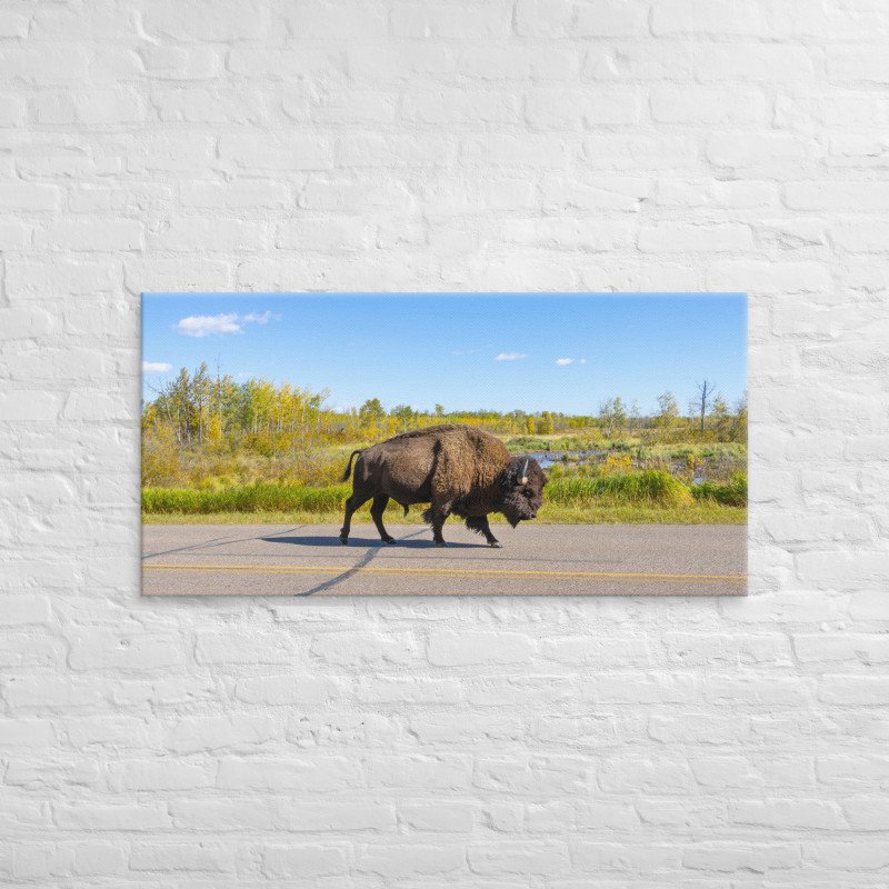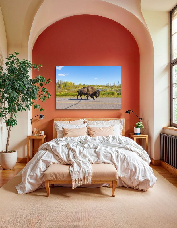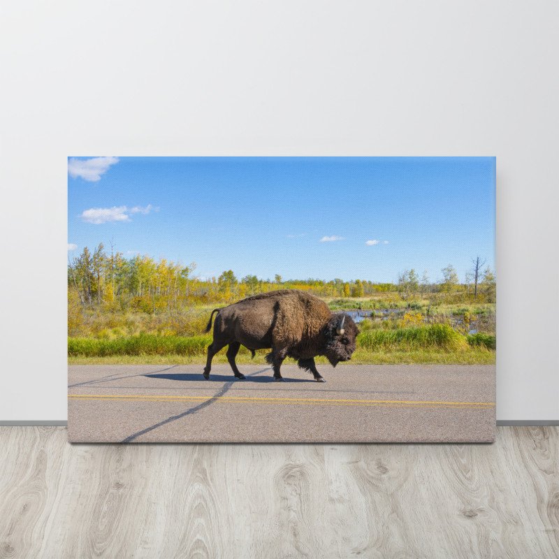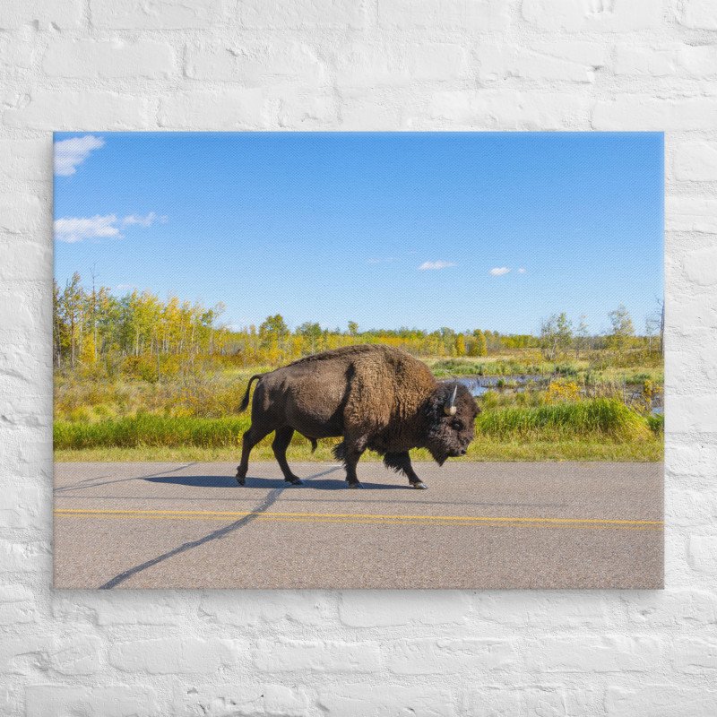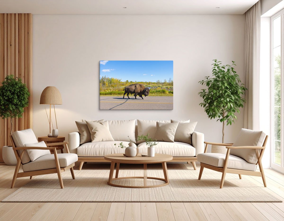 Add bold prairie energy to your space with this striking canvas print of a lone bison walking confidently down a summer sunlit road. Captured at Elk Island National Park in Alberta, this bright and vibrant wildlife photo brings Canada's rugged beauty to life—complete with bright light, rich tones, and a larger-than-life subject.