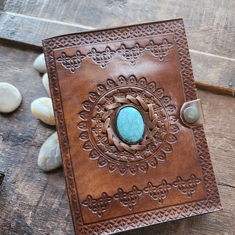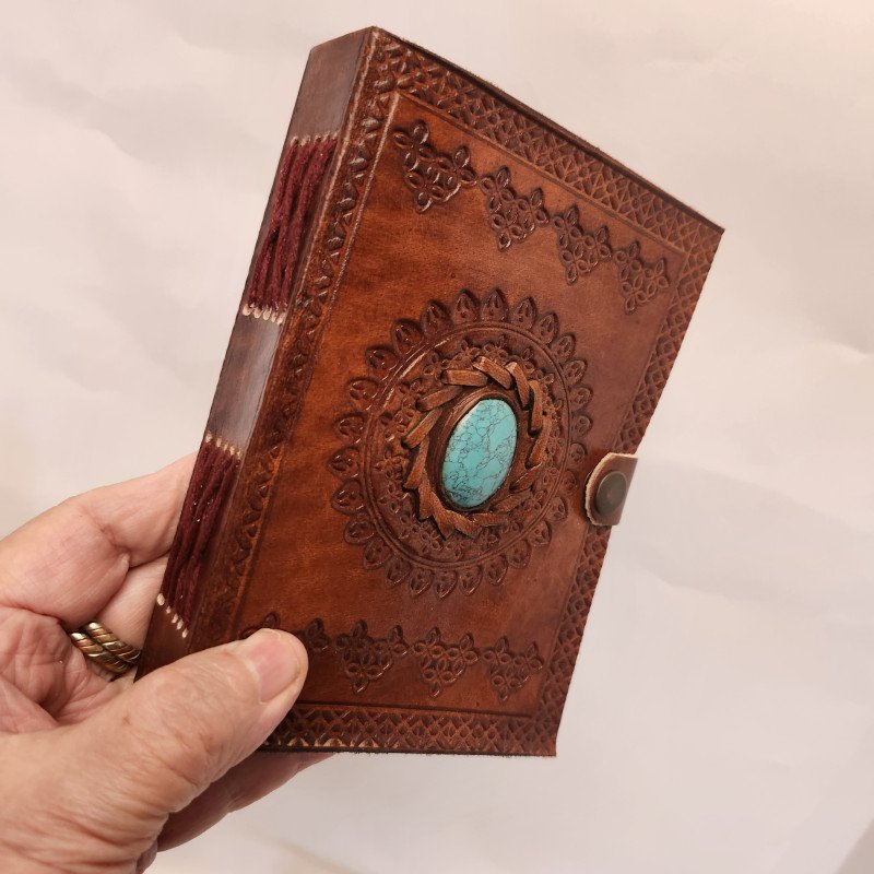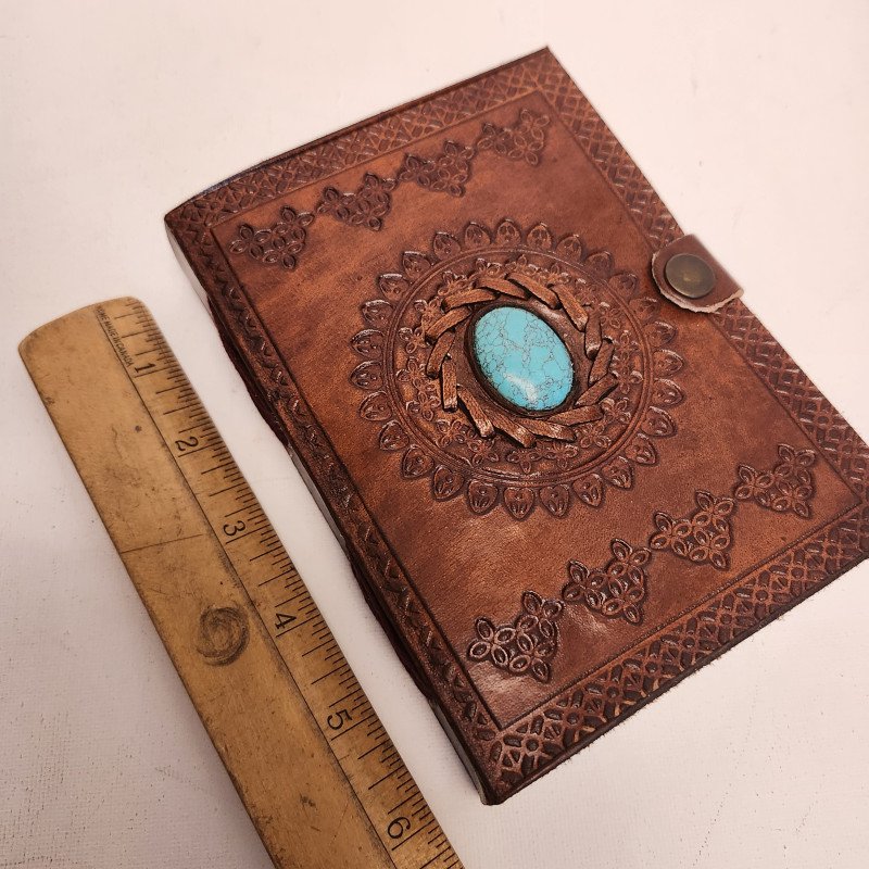 Fabulous turquoise studded chestnut brown leather bound diary/journal with quality blank paper pages.