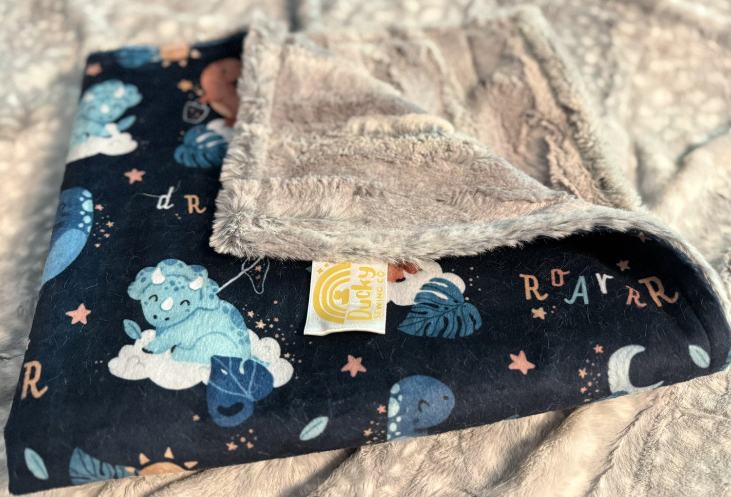 Measuring 18" by 36", this minky baby blanket features stunning Spoonflower fabric on the front showcasing an independent artist’s design. The reverse side is crafted from "Grey Hide" plush, extra-high pile minky, offering exceptional softness. Made with premium-quality materials, this throw combines artistry and luxury for lasting comfort.