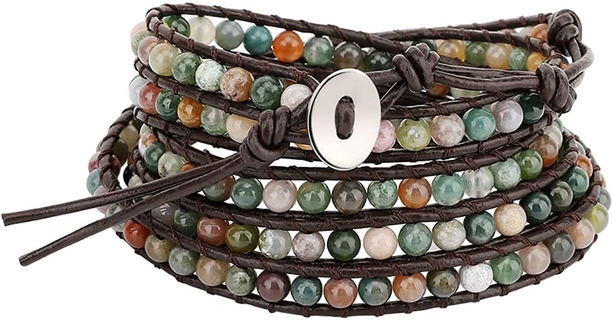 Emibele Layered Leather Bracelet, Rivet Leopard Print Bohemian Style Multilayer Wrap Bracelet, Handmade Agate Amethyst Chakra Crystal Glass Beaded Shell Bracelet for Women