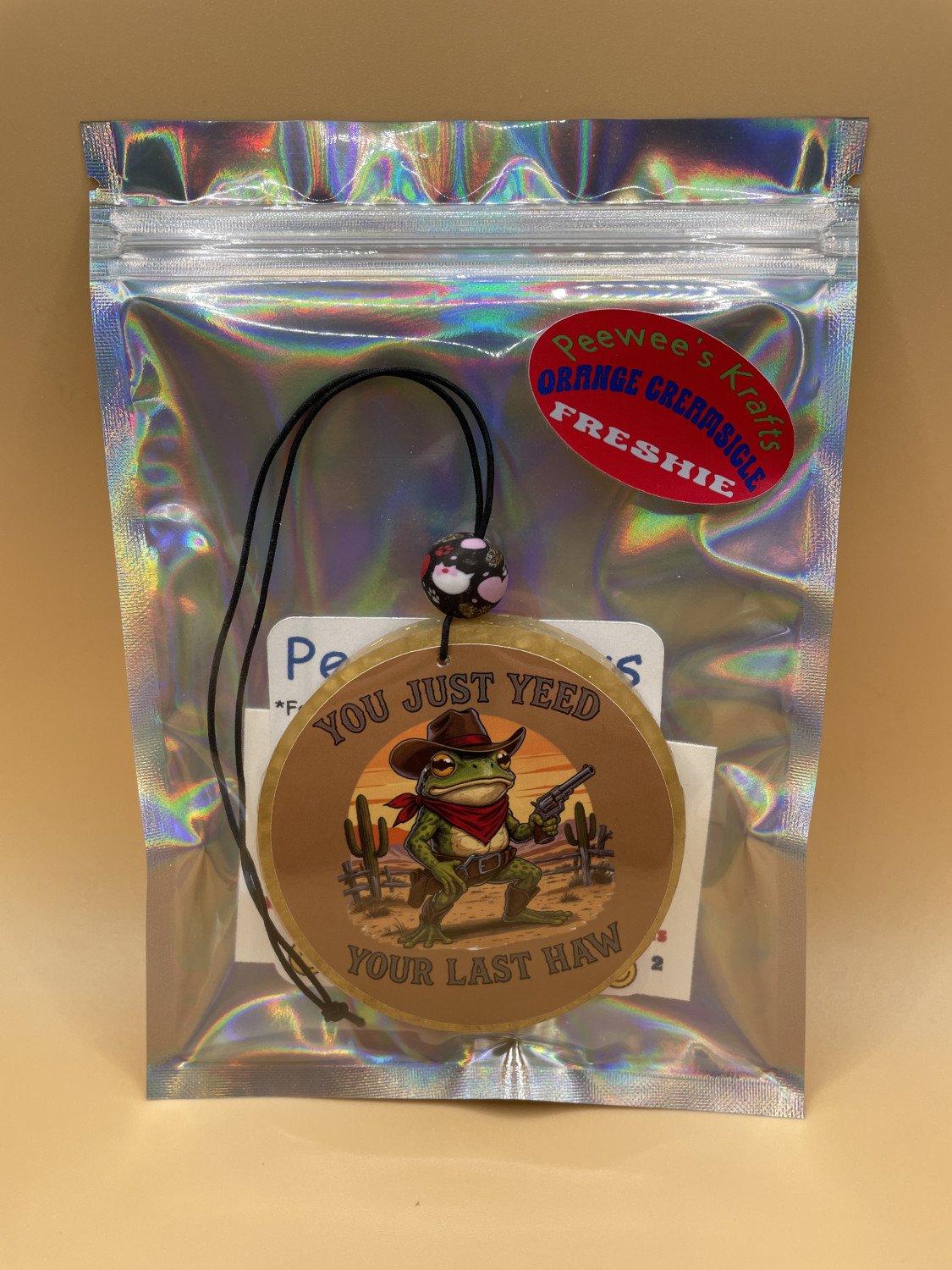 My car freshies are made from baked aroma beads so the fragrance is baked right into the freshie. They are long lasting 1 to 2 months and some customers have told me theirs have lasted as long as 3 months. They come in a airtight smell proof package and will last in the packaging for months before being used. They are 3" X 1/2" round.