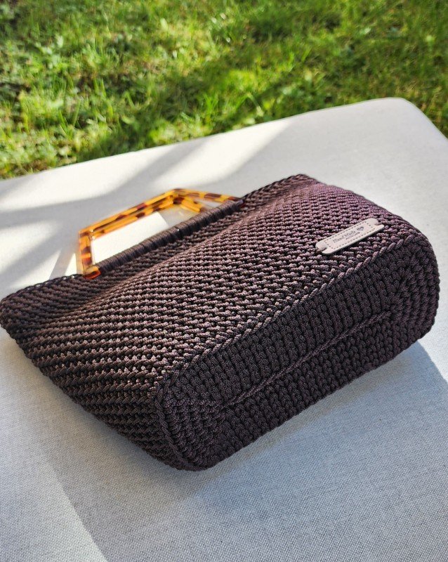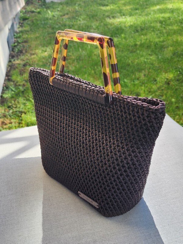 Handcrafted Coffee Color Crochet Bag with Trapezoid Plastic Handles