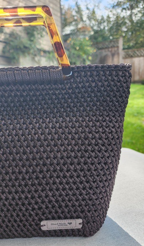 Elevate your style with this handcrafted crochet bag in a dark coffee shade, designed for both elegance and practicality. Made from premium polyester cord, this bag features unique trapezoid handles. As a charming detail, it also includes a small Canadian maple leaf charm, giving it a subtle touch of Canada.