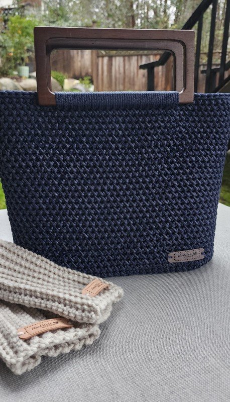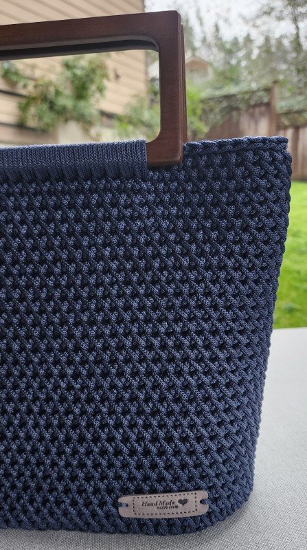 Elevate your style with this handcrafted crochet bag in a deep blue shade, designed for both elegance and practicality. Made from premium polyester cord, this bag features unique wooden handles, adding a natural, eco-friendly touch to its sophisticated look. As a charming detail, it also includes a small Canadian maple leaf charm, giving it a subtle touch of Canada.