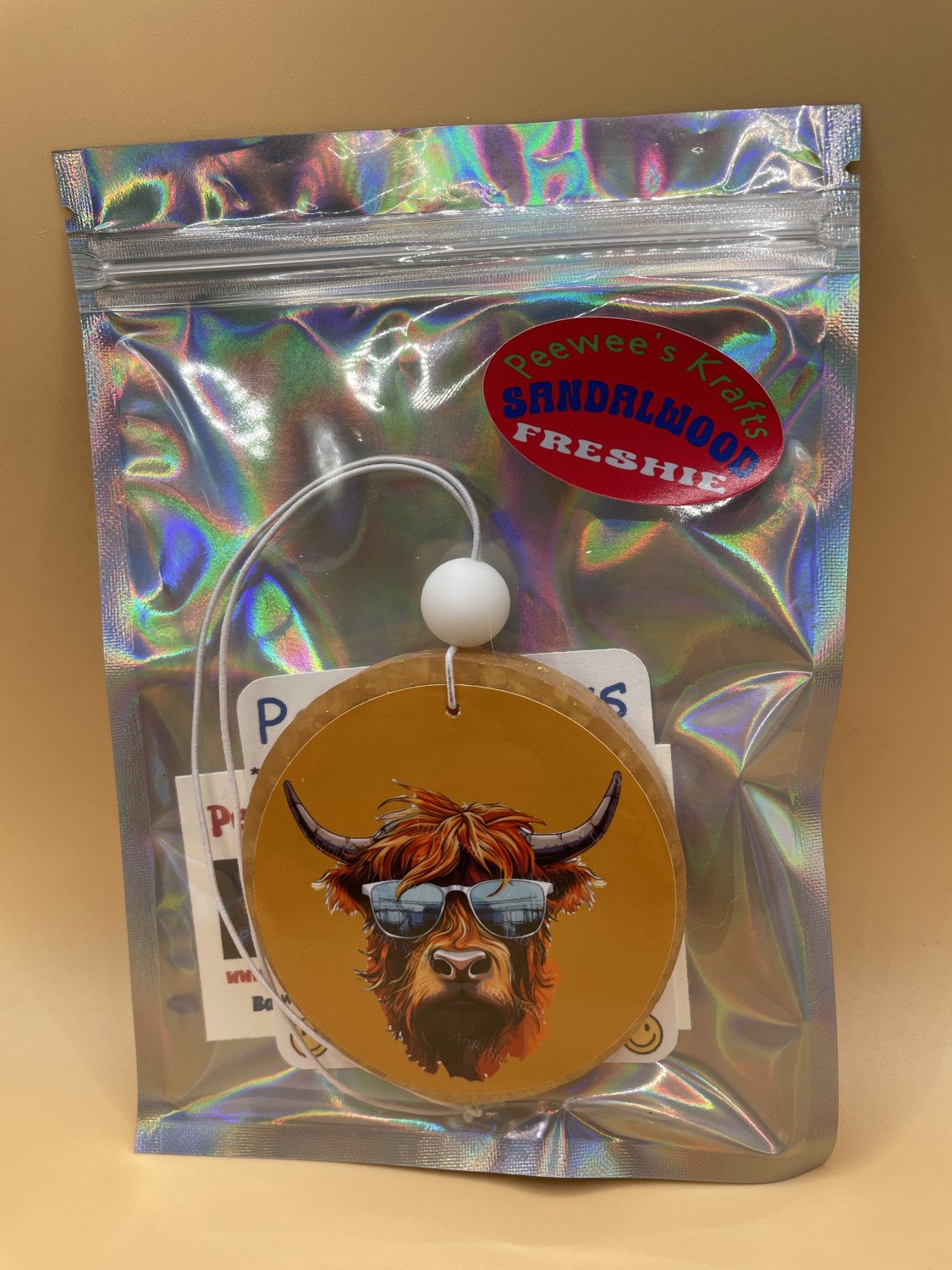 My car freshies are made from baked aroma beads so the fragrance is baked right into the freshie. They are long lasting 1 to 2 months and some customers have told me theirs have lasted as long as 3 months. They come in a airtight smell proof package and will last in the packaging for months before being used. They are 3" X 1/2" round.