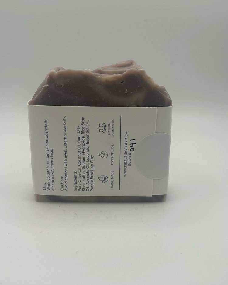 Pure Olive Oil, Coconut Oil, Goat Milk, Shea Butter, Sodium Hydroxide*, Rice Bran Oil, Avocado Oil, Lavender Essential Oil, Purple Brazilian Clay