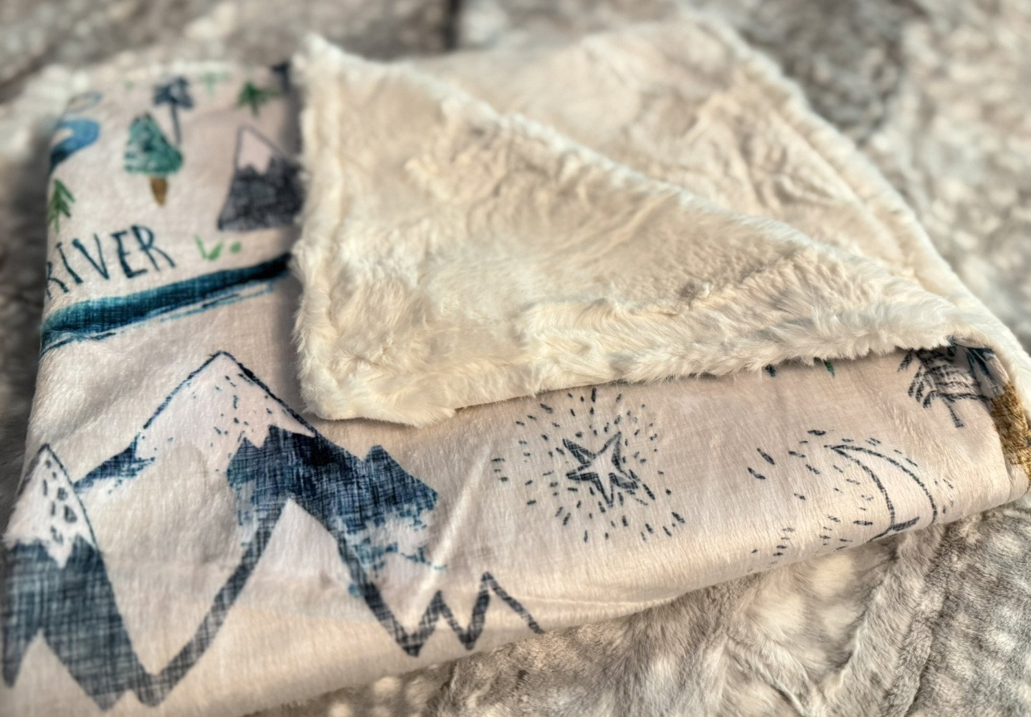 Measuring 18" by 36", this minky baby blanket features stunning Spoonflower fabric on the front showcasing an independent artist’s design. The reverse side is crafted from "Cream Hide" plush, extra-high pile minky, offering exceptional softness. Made with premium-quality materials, this throw combines artistry and luxury for lasting comfort.