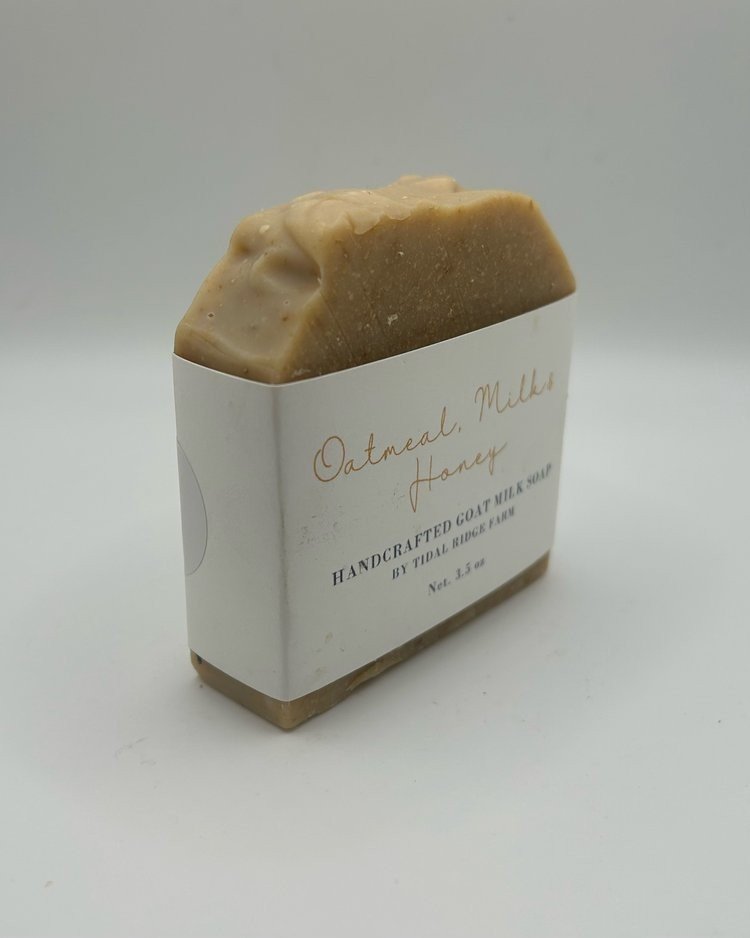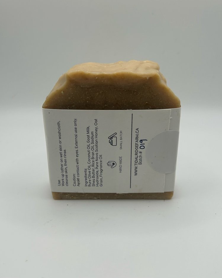 Pure Olive Oil, Coconut Oil, Goat Milk, Shea Butter, Rice Bran Oil, Sodium Hydroxide*, Pure Nova Scotian Honey, Oat Grain, Fragrance Oil