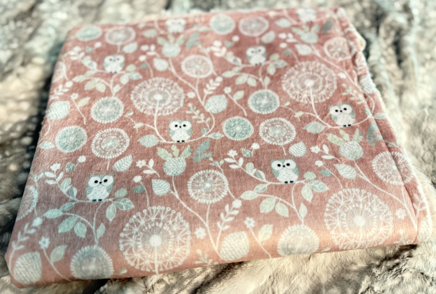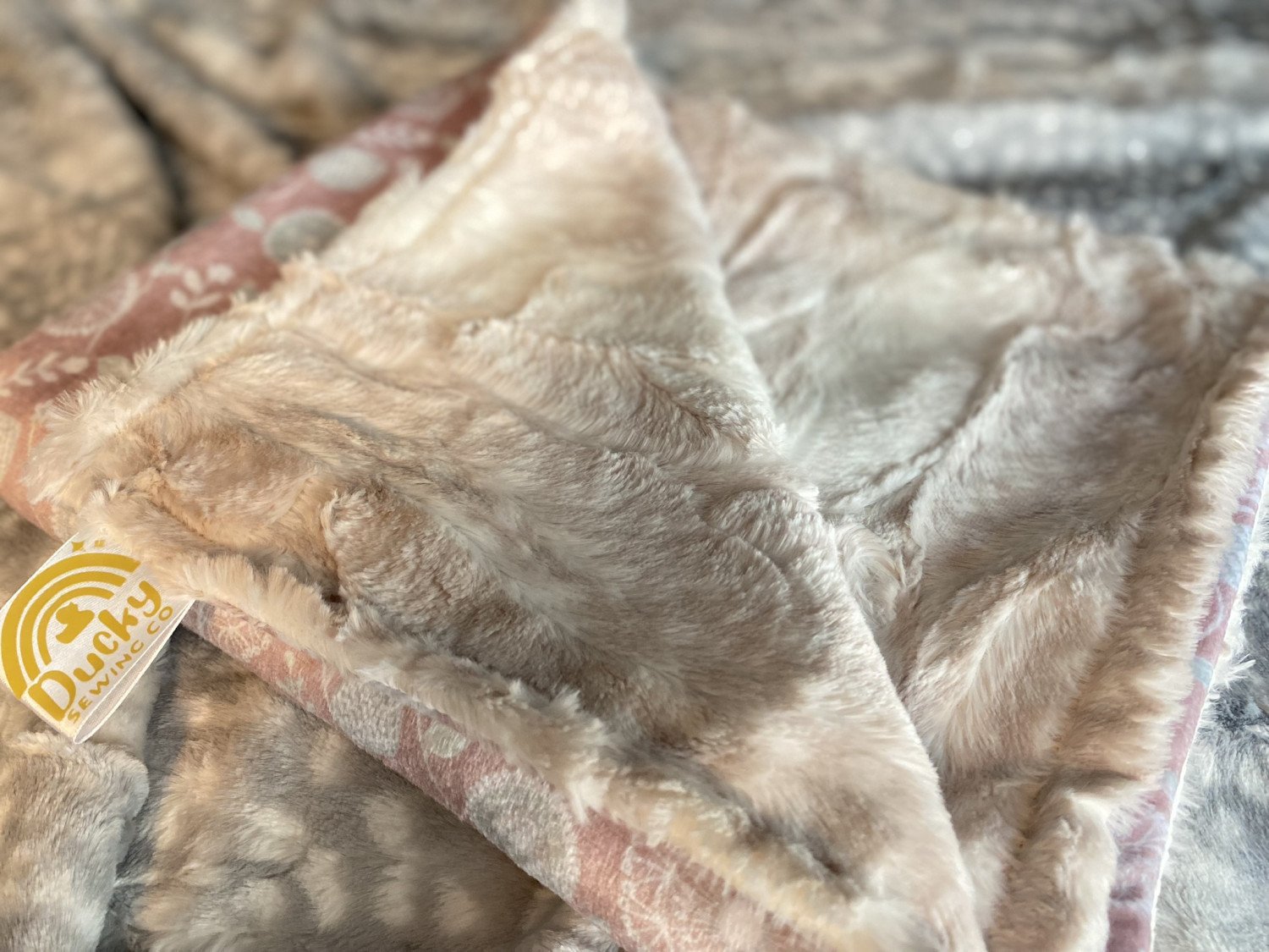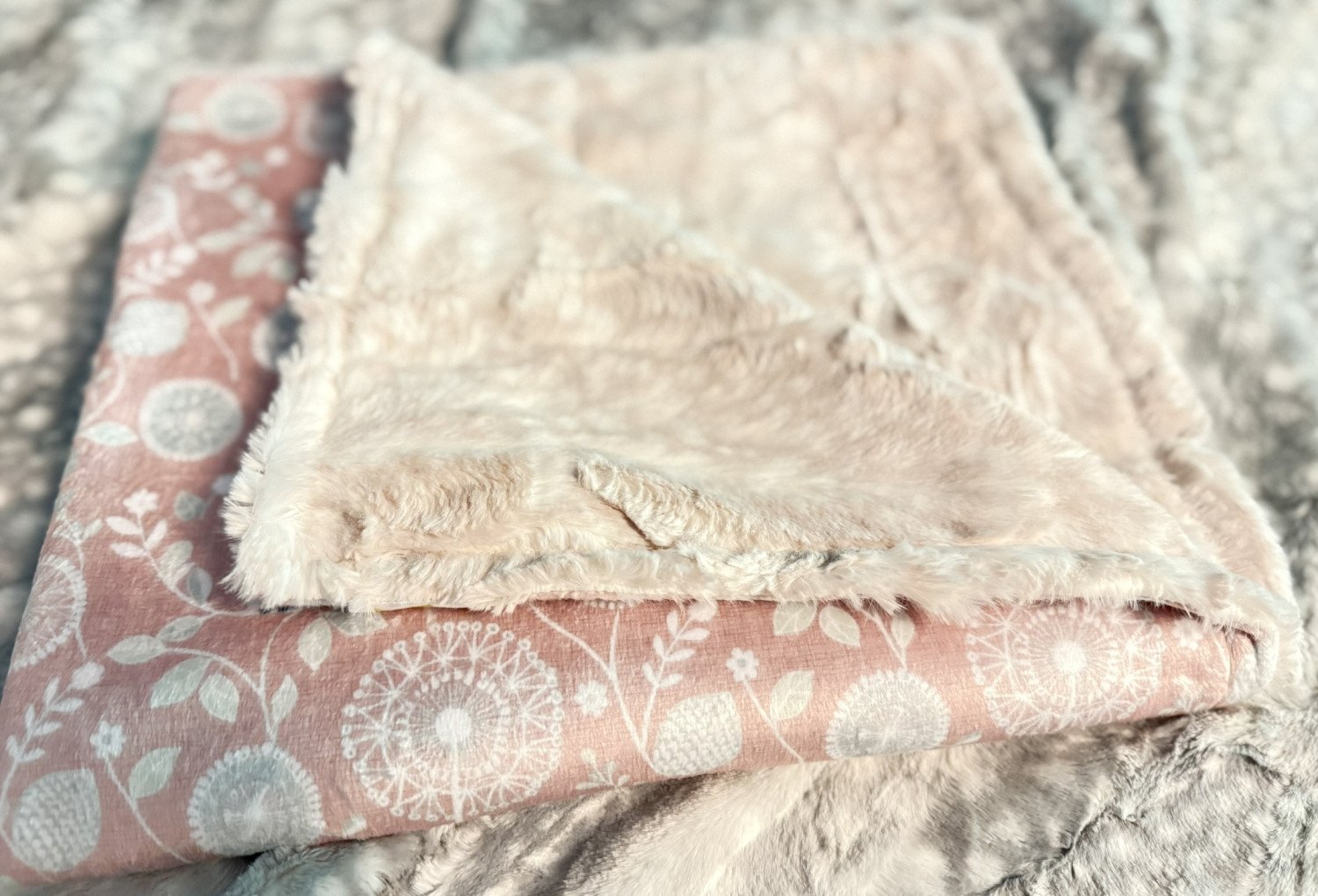 Measuring 18" by 36", this minky baby blanket features stunning Spoonflower fabric on the front showcasing an independent artist’s design. The reverse side is crafted from "Pink Fawn Hide" plush, extra-high pile minky, offering exceptional softness. Made with premium-quality materials, this throw combines artistry and luxury for lasting comfort.