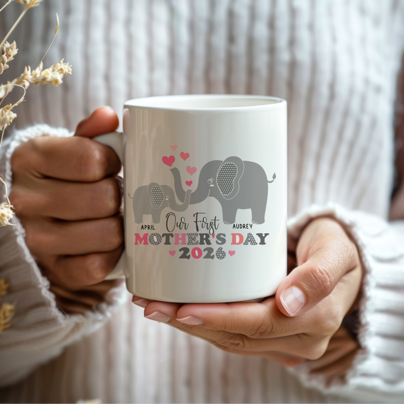 Celebrate motherhood with this personalized ceramic mug featuring a charming mother and child elephant in soft gray. It reads "Our First Mother's Day 2026" in stylish gray and an accent colour, with a customizable year. Add the names of mother and child for a personal touch.