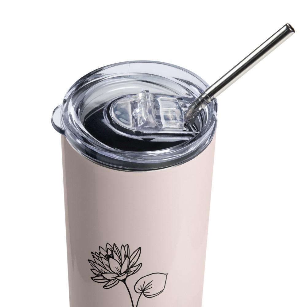 Enjoy hot or cold drinks on the go with this stylish Personalized Birth Month Flower & Arabic Name Wisp Pink stainless steel tumbler! This reusable tumbler with a metal straw is a perfect combo for hot or cold drinks at any time of the day.