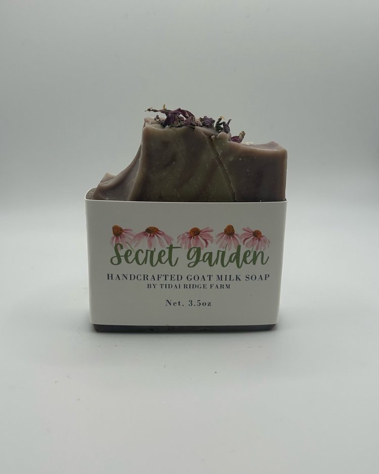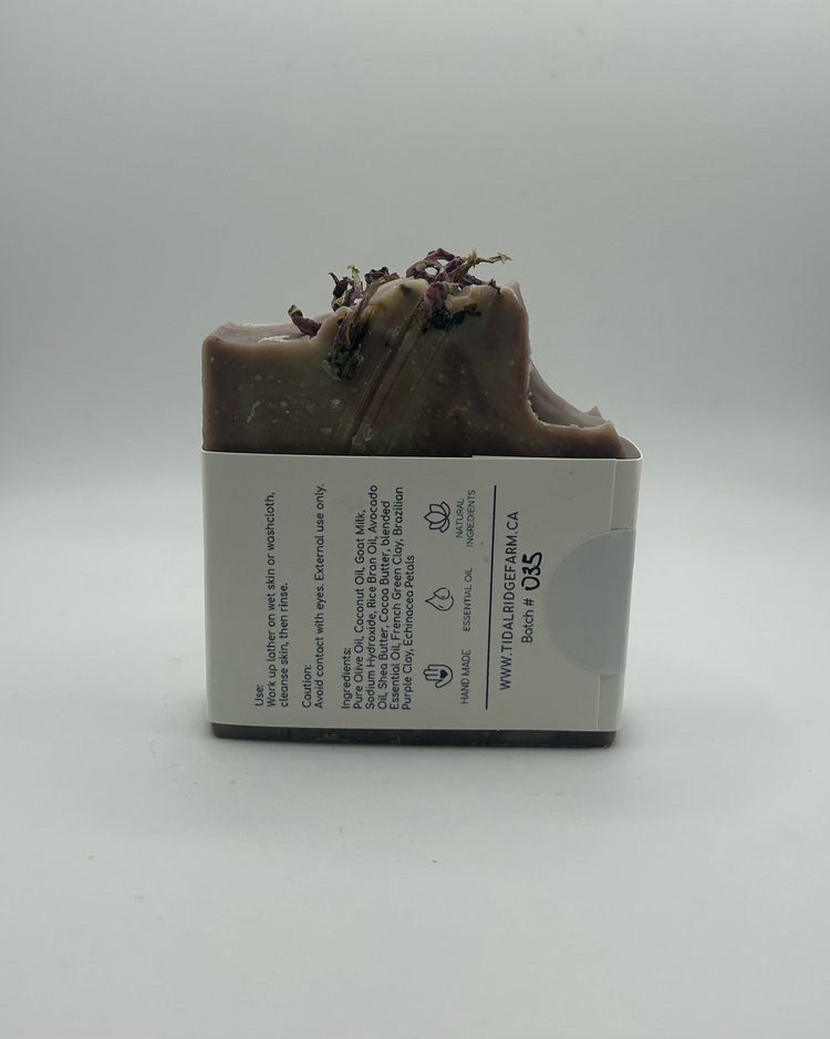 Pure Olive Oil, Coconut Oil, Goat Milk, Sodium Hydroxide*, Rice Bran Oil, Avocado Oil, Shea Butter, Cocoa Butter, blended Essential Oils, French Green Clay, Brazilian Purple Clay, Echinacea Petals.