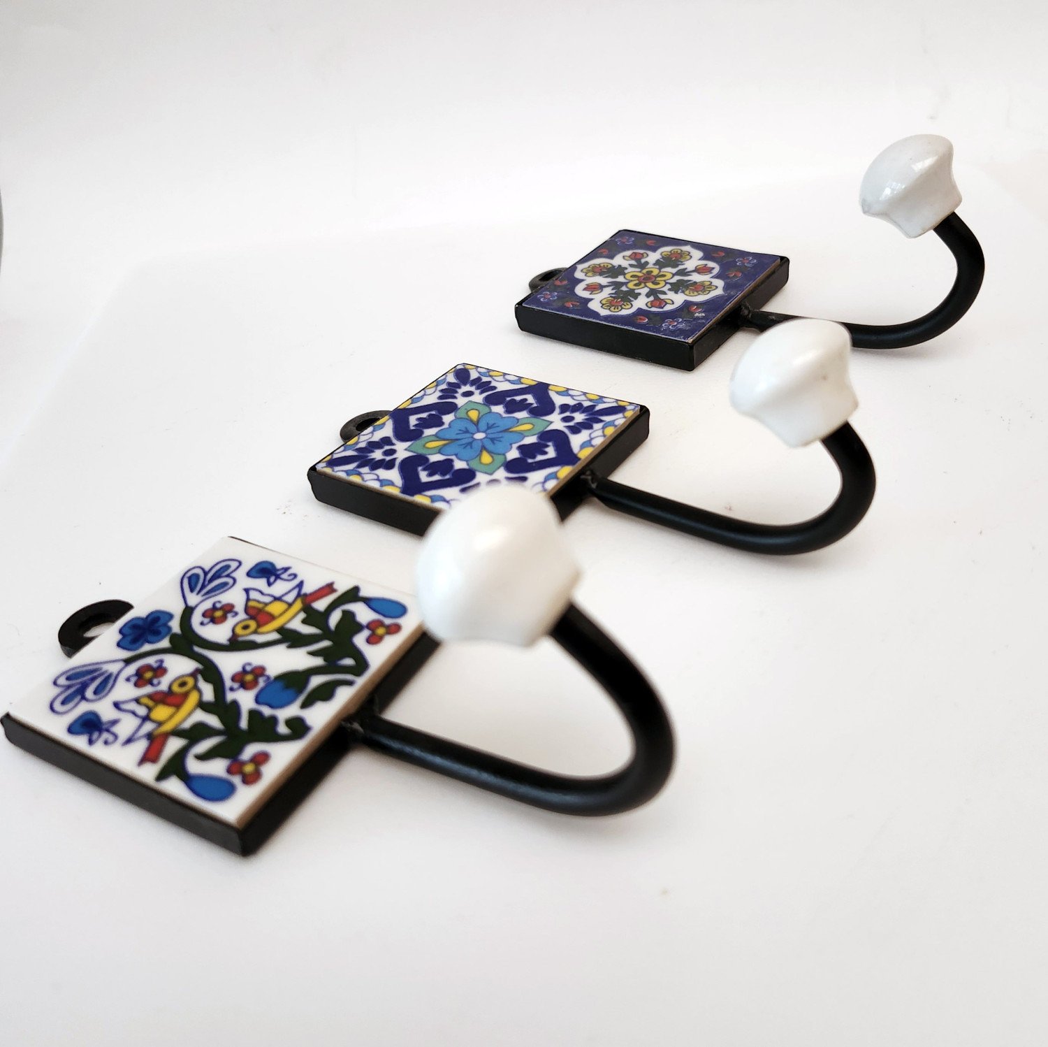 3 home organizer wall hooks in vibrant blue, yellow and white color palette.