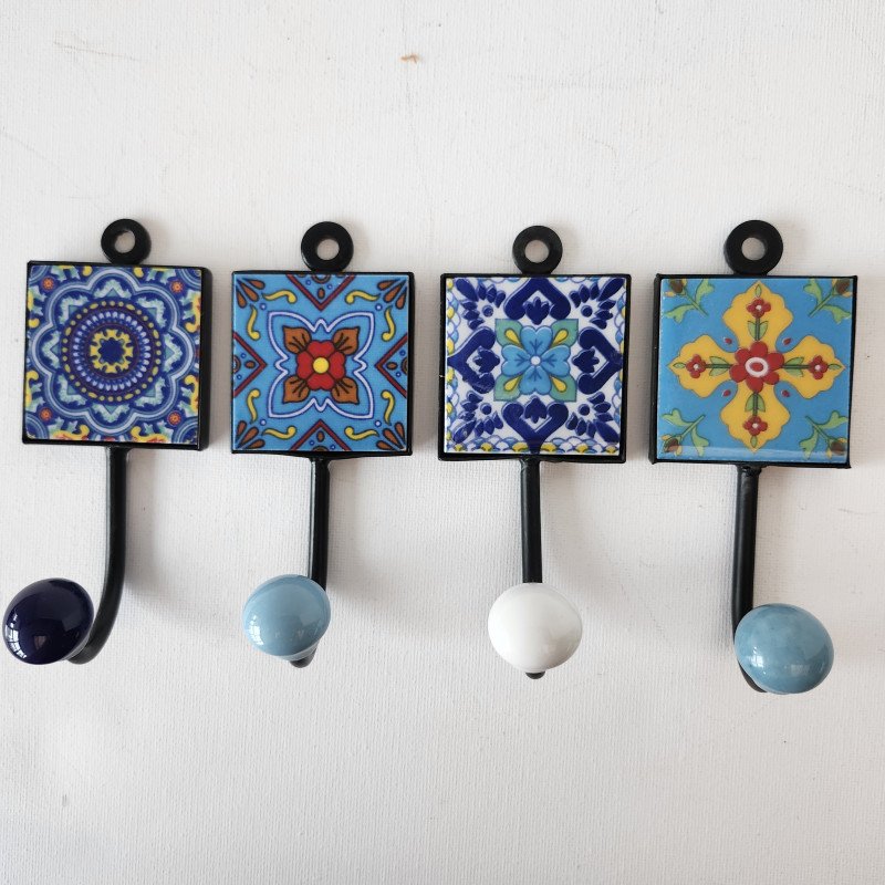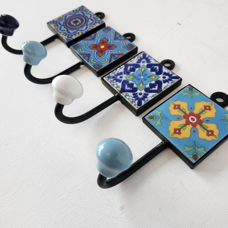 Colorful ceramic tile with a black sturdy, wrought iron frame.