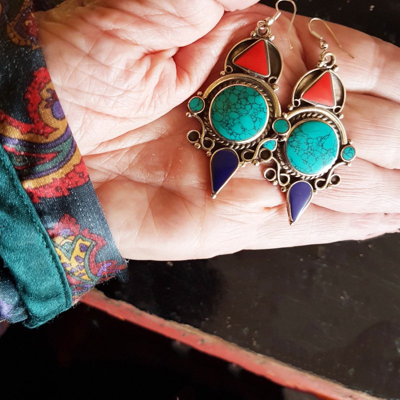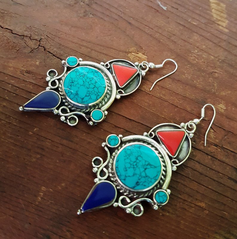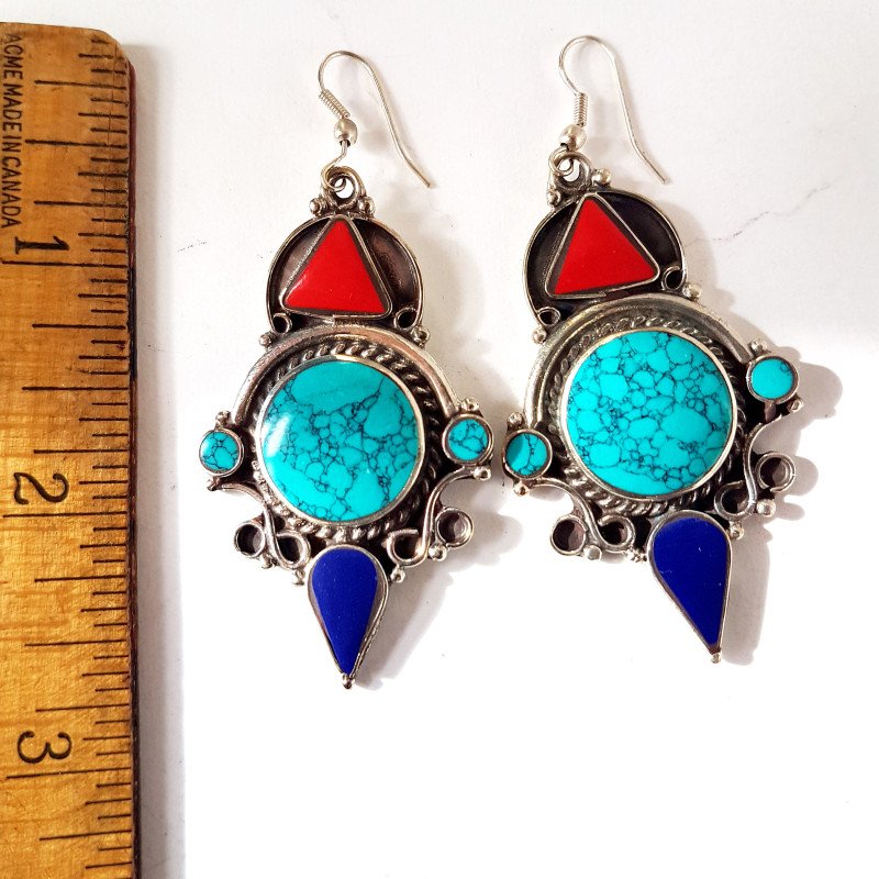 Silver Tibetan tribal earrings with multicolor turquoise, cobalt blue and deep red semi precious stone inlay.
