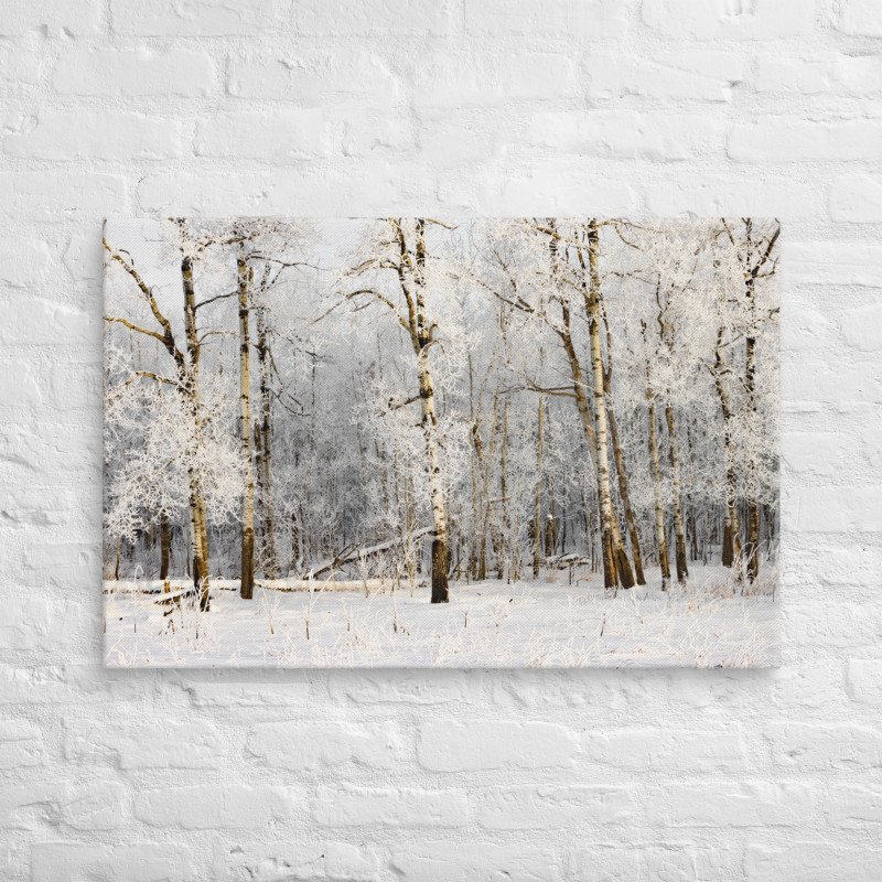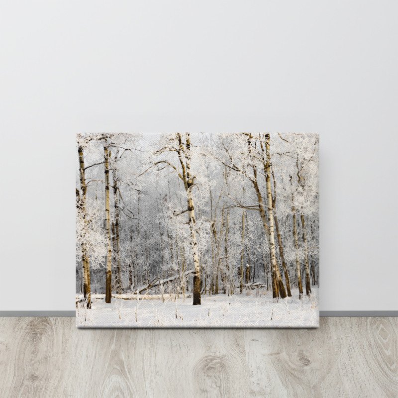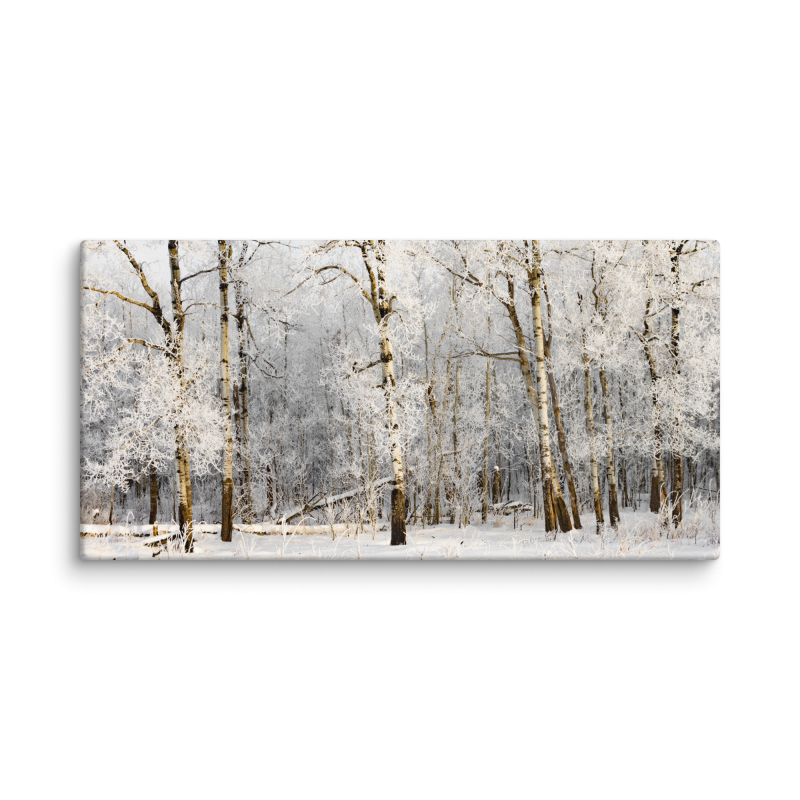 Embrace the serene beauty of a frosty Canadian winter with this captivating landscape canvas print. Hoar frost clings to delicate birch branches, while fresh snow blankets the forest floor, creating a peaceful scene that feels crisp, quiet, and still. This piece brings the magic of a cold winter morning into your home with a minimalist and calming aesthetic.